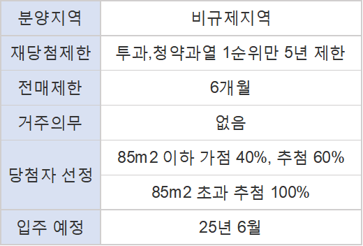 전매제한 6개월, 거주의무는 없습니다. 당첨자는 85m2 추첨 60%, 85m2 초과는 추첨 100%으로 선정을 합니다.