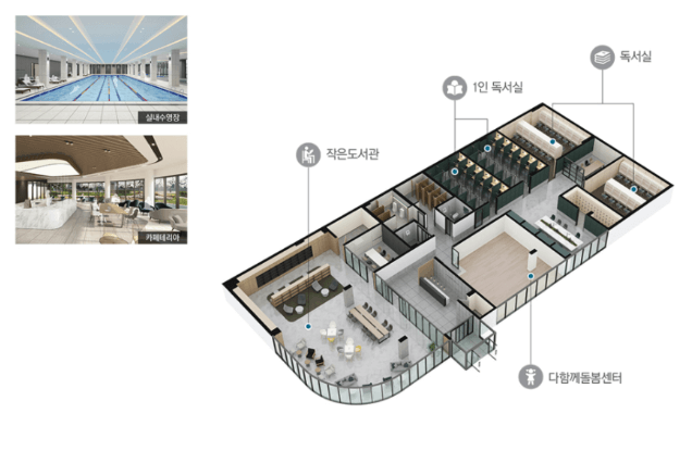 실내 수영장은 기본으로 있고 키즈풀과 사우나, 카페테리아, 피트니스 클럽도 모두 있습니다. 또한 골프 연습장 탁구장, 라커룸 등 다양한 체육활동을 즐길 수 있는 둔산 자이 아이파크만의 확실한 커뮤니티가 조성되는 단지입니다.