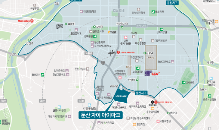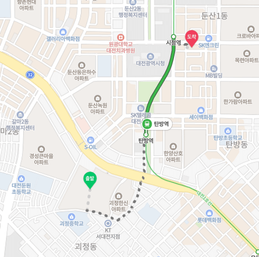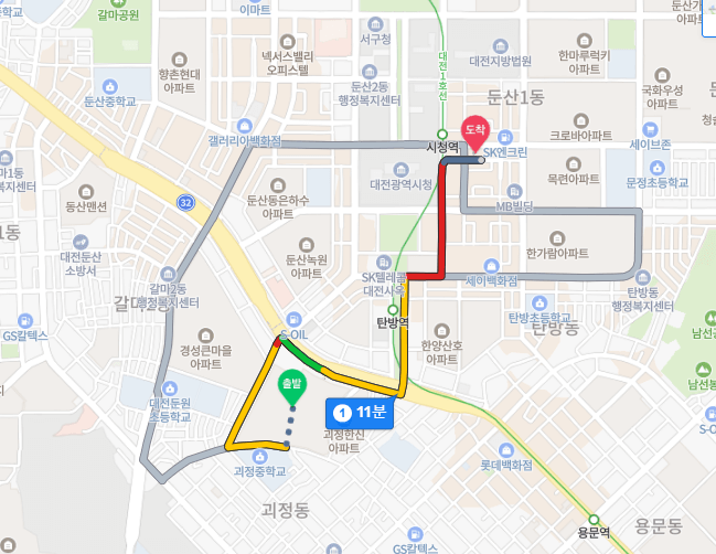 인터넷에 보면 대전에 실거주 오래 하신 분들은 둔산이라고 써놨지만 둔산이 아니다는 이야기가 많습니다. 그래도 학원가로 라이딩이 불가능한 거리는 아니니 참고해 주세요. 지도상 보면 차로는 11분 정도이고 전철은 1 정거장입니다.