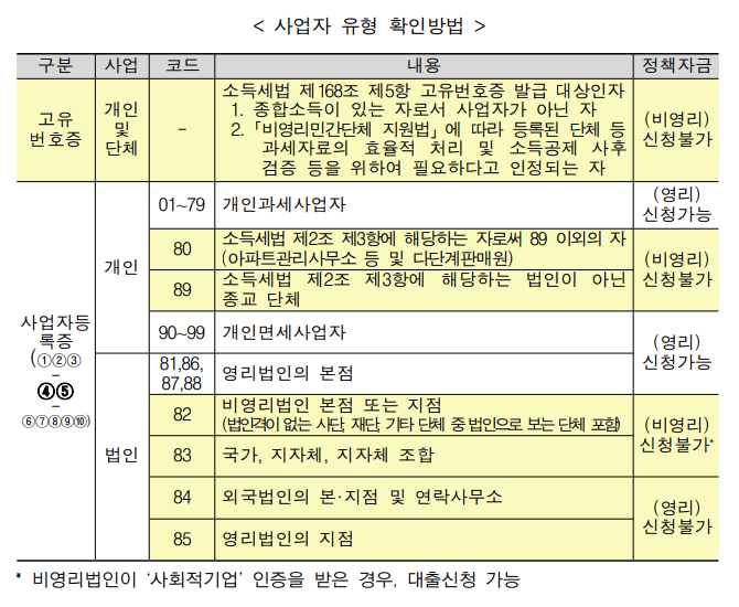 사업자등록번호 가운데 번호로만 봐도 대출 신청할 수 있는지 없는지 알 수 있습니다.
