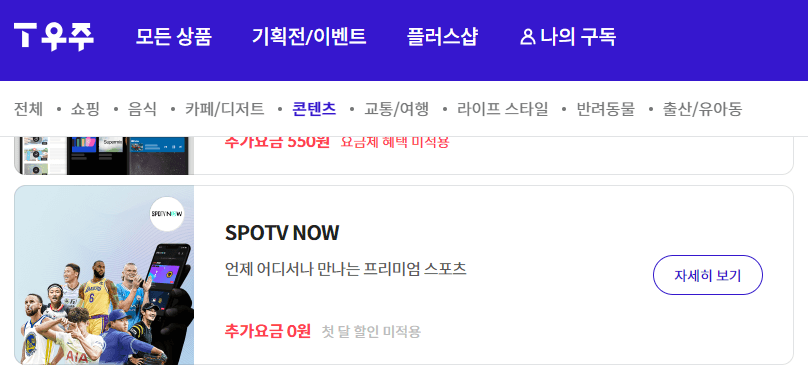 SKT이용하는 고객 중 등급에 따라 VIP라면 우주패스 ALL 가입은 무료로 할 수 있어요. 이때 우주패스도 원하는 서비스를 선택할 수 있는데 여기에서도 스포티비를 볼 수 있어요.