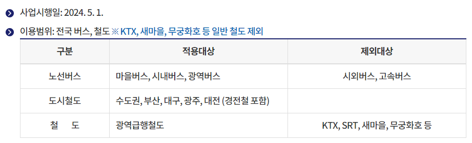 전국 모든 대중교통 즉 마을버스, 시내버스, 광역버스 모두 적용되고 도시철도 수도권, 부산, 대구, 광주, 대전(경전철 포함), 광역급행철도인 GTX도 포함됩니다.
